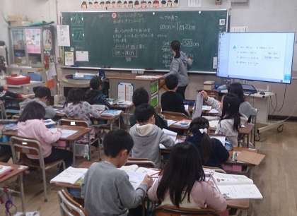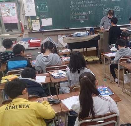 2年生の算数で、長さの学習に取り組んでいます。長いものの長さを表すのにm(メートル)という単位を使うことを学んでいます。