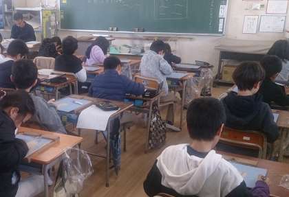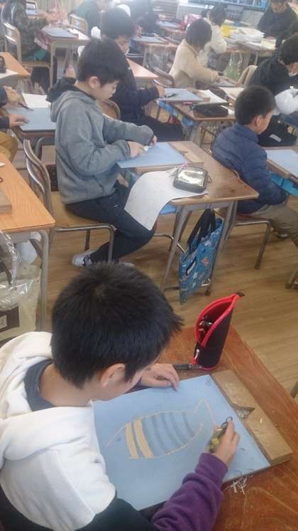 4年生の図工で、木版画に取り組んでいます。子どもたちは、慎重に彫刻刀で彫っています。
