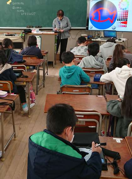 プログラミングに挑戦しています。今日は、自分の描いた魚を動かすプログラムを作りました。