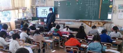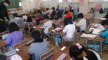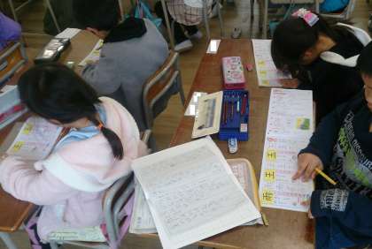 1年生の国語で、漢字の学習に取り組んでいます。新出漢字を丁寧にドリルに書いています。