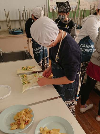 今日は6年生が調理実習をしました。サンドイッチやジャーマンポテト、チョコバナナを作り、今までお世話になった先生たちに食べてもらいました。