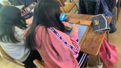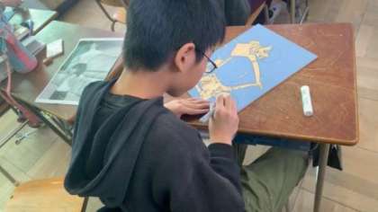 6年生も木版画に取り組んでいます。5年生は「楽器を演奏する自分」をテーマにしていますが、6年生は「組立体操」をテーマに作品造りを進めています。