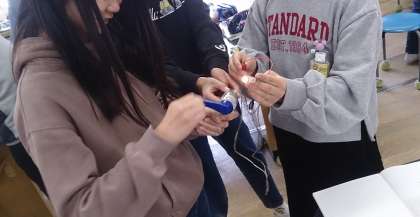 6年生の理科で、天気の性質とその利用について学んでいます。回し発電機に豆電球やコンデンサーをつないで実験しています。