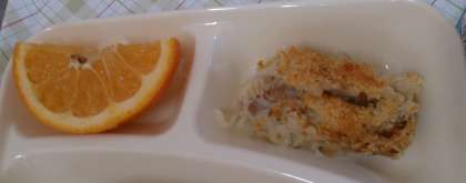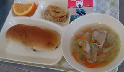 今日の給食は、押麦のグラタン、スープ、いよかん、パン、牛乳です。