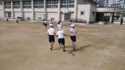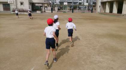 2年生の体育で、かけ足運動に取り組んでいます。子どもたちは、自分なりのペースで、リズムよく走っています。