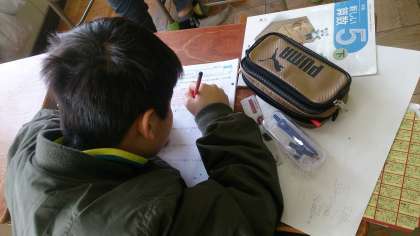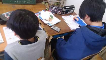 5年生の算数で、まとめの学習に取り組んでいます。ドリルを使って、丁寧にまとめの問題に取り組んでいます。