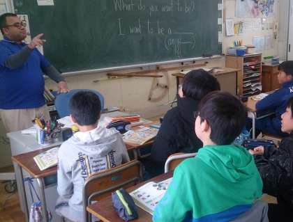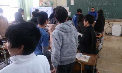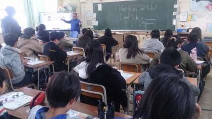 6年生の外国語学習で、「将来の夢」について、英語で相手に伝える活動に取り組んでいます。友だち同士で、応答的に質問と答えを伝えています。