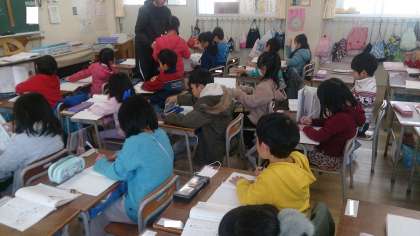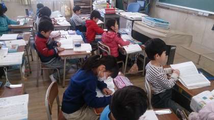 1年生の国語で、「じゃんけんやさんをひらこう」の単元の学習に取り組んでいます。この時間の学習では、勝ったり負けたりする関係を確かめて、その仕組みを学んでいます。