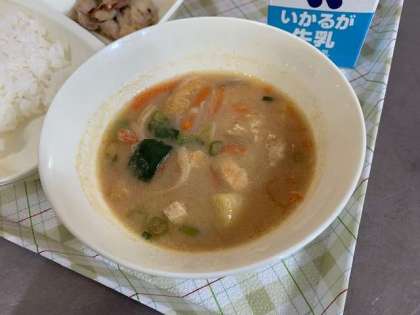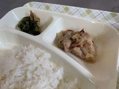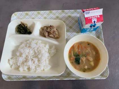 今日の給食は、鶏肉のゆず塩焼き、さつまいものおみそ汁、こまつなのにびたし、ごはん、牛乳です。