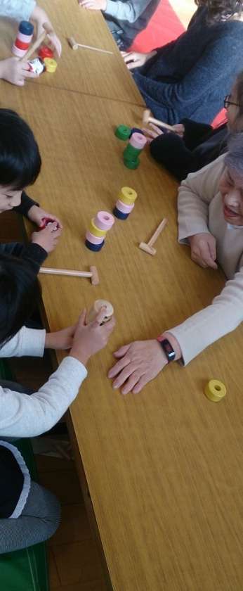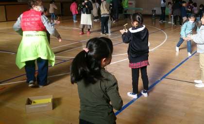 1年生の子どもたちから、「楽しいね」という言葉が聞こえてきました。写真は、竹とんぼ、駒、だるまおとしを楽しんでいる子どもたちです。