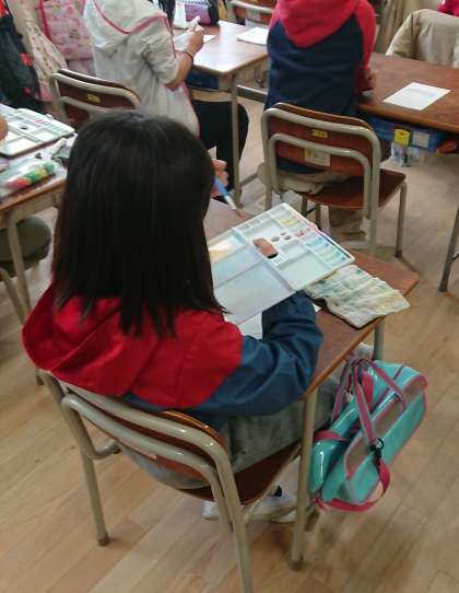 自分の似顔絵に絵の具で色をぬっていきます。混色して自分で色を作りました。