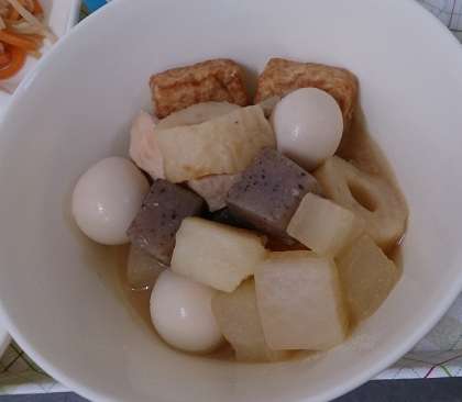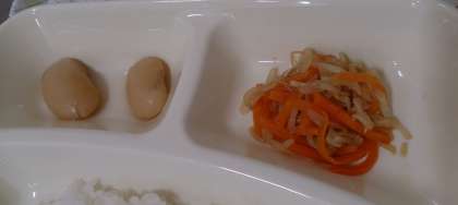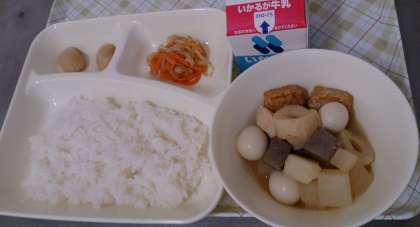 今日の給食は、関東煮、もやしとにんじんの甘酢あえ、白花豆の煮もの、ごはん、牛乳です。