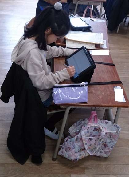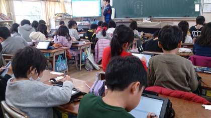 1年生の国語で、「じゃんけんやさんをひらこう」の単元の学習に取り組んでいます。タブレットを活用して、学習のまとめをしています。