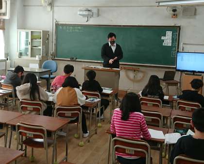 授業の始めに、今日の学習のめあてを確かめています。今日は「真分数や仮分数のたし算、ひき算をしよう。」です。