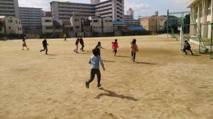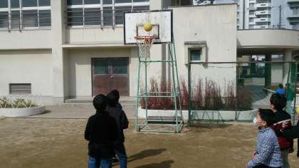 快晴の秋空の下、子どもたちは、バスケットボールや縄とび、鬼ごっこなどで、休み時間に楽しく遊んでいます。