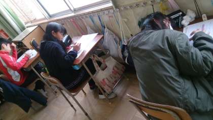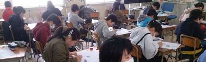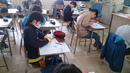 6年生の国語で、学習のまとめをしています。鉛筆を走らせる音だけが聞こえる静けさの中、子どもたちは真剣に集中して取り組んでいます。