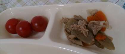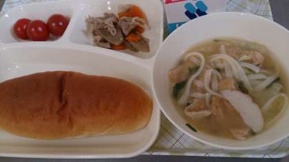 今日の給食は、豚肉とごほうの煮もの、なにわうどん、プチトマト、ブルーベリージャム、パン、牛乳です。
