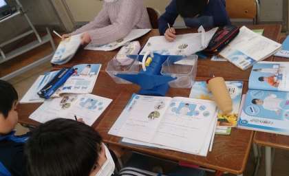 3年生の理科で、単元「ものと重さ」の学習に取り組んでいます。身近にあるものを、てんびんを使って重さ比べをしています。