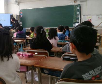 2年生が、朝の時間に外国語活動に取り組んでいます。デジタル教材の音声に合わせて、英語の発音に慣れ親しんでいます。