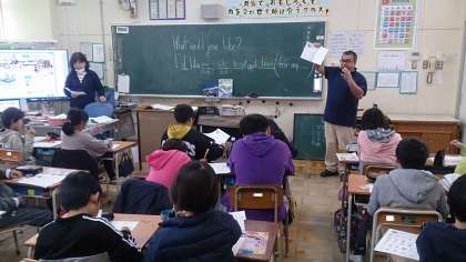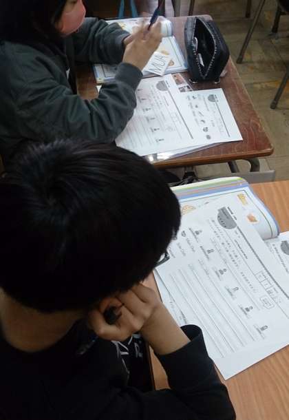 5年生の外国語活動で、食事や飲み物についての学習に取り組んでいます。英語で、ワークシートに自分の好きな食事のメニューや飲み物を書いています。