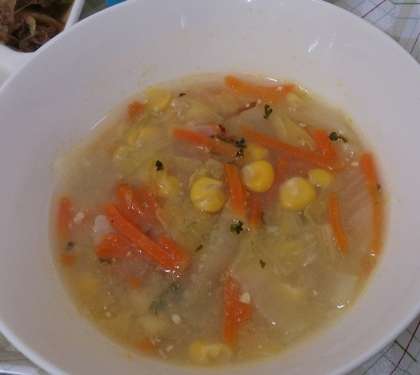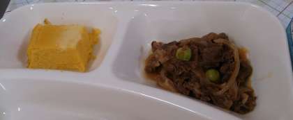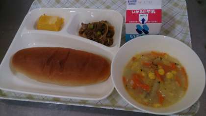 今日の給食は、牛肉のデミグラスソース煮、コーンスープ、かぼちゃのプリン、パン、牛乳です。