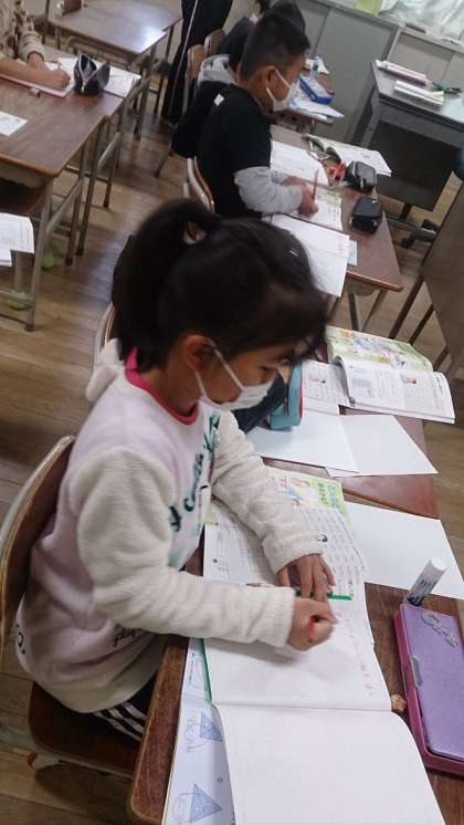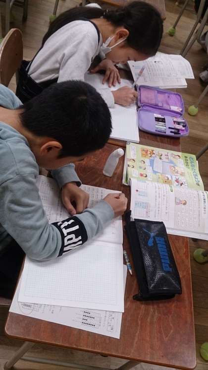 3年生の算数で、「見やすく整理しよう」の学習に取り組んでいます。資料を分類整理する要領を知り、「正」の字を使って調べることができるように学んでいます。