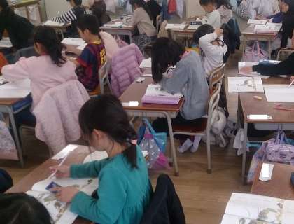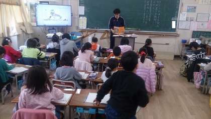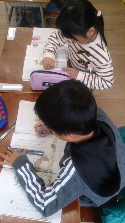 1年生の国語で、物語文「スイミー」の学習に取り組んでいます。この授業では、物語の登場人物について学んでいます。下の写真は、登場人物にサイドラインを引いている子どもたちの様子です。