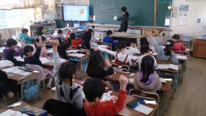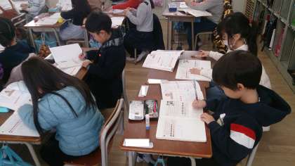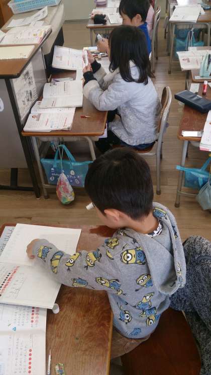 1年生の算数で、文章題に取り組んでいます。文章問題をノートに丁寧に貼り、課題を解いています。