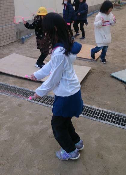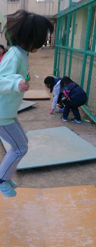 休み時間に、子どもたちは元気に遊んでいます。写真は、縄跳びを熱心にする子どもたちの様子です。