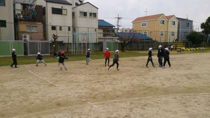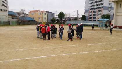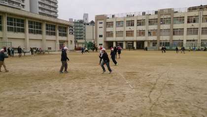 お昼休みに、4年生が運動場の真ん中に集まっていました。その後、ふえ鬼をしていました。みんなとても楽しそうでした。