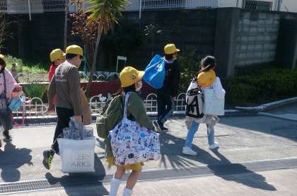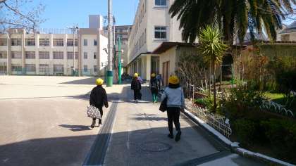 1〜3年生の下校に続いて、4・5年生も元気に登校しています。写真は、1〜3年生の下校の様子と4・5年生の登校の様子です。