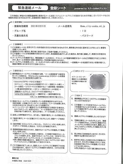 2.保護者メールは、昨年度登録されている方も、「令和2年度」として改めて登録していただく必要があります。非常変災時や今回の臨時休業に関わること等連絡手段として非常に重要ですので、必ず登録いただけるようよろしくお願いいたします。