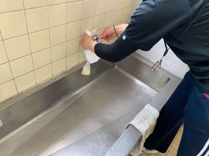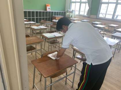 先生たちで手分けして、児童の入れ替え時に、机やドアノブ、手すりなどの使用箇所をアルコール消毒しています。