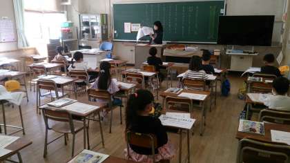 本日も、学習プリントやマスク等を配布します。図書カードにつきましては、子どもたちが持ち帰りましたら確認をお願いいします。写真は、2年生の奇数班の学級での様子です。子どもたちは、課題の説明等をしっかりと聞いています。