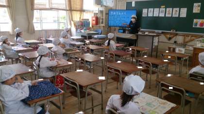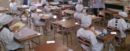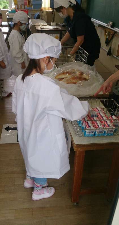 後半グループは、給食を食べてから、学習に取り組みます。1年生は、給食の配膳の仕方等の説明を聞いてから、準備に入ります。写真は、給食を食べている時と配膳時の様子です。