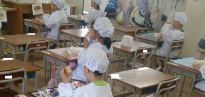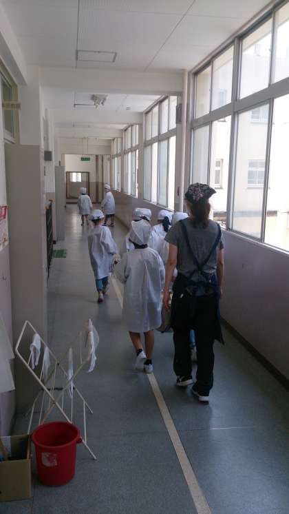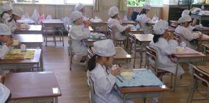 写真は、給食を食べている1年生と給食室から食器や牛乳等を運んでいる2年生の様子です。