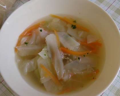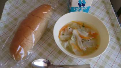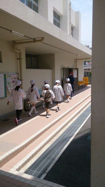 今日の給食は、豚肉とキャベツのスープ、黒糖パン、牛乳です。下の写真は、給食を取りに行く4年生の様子です。