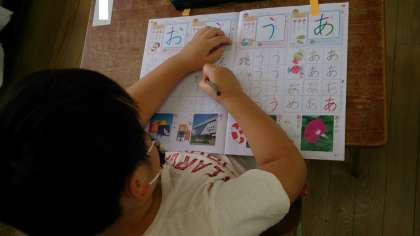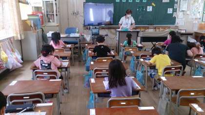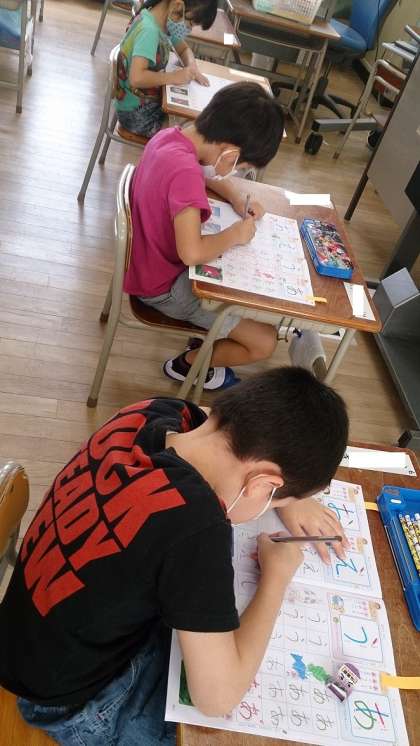 1年生は国語の学習で、ひらがなの「え」「お」の文字について学んでいます。丁寧に集中して書いています。