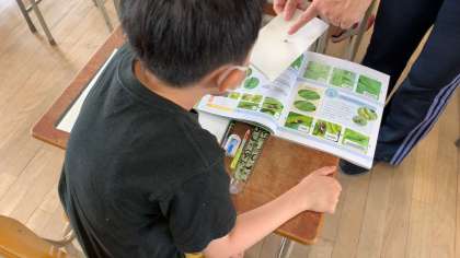 「チョウを育てよう」で、実際にアゲハの幼虫や、脱皮した皮などを見て学習していました。