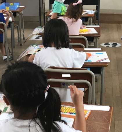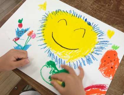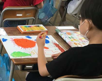 パスを使って、「おひさまにこにこ」の絵を描きました。おひさまのまわりに、雲や虹を描いて仕上げました。