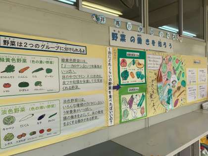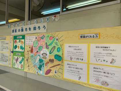 6月は「食育月間」です。今年度は「野菜」への関心を高めるため、給食主任が自らイラストを描き、職員室前の掲示物を作成しました。