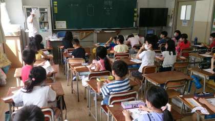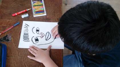3年生の図画工作で、人物の顔の描き方について学習しています。子どもたちは、表情豊かな顔を描画しています。