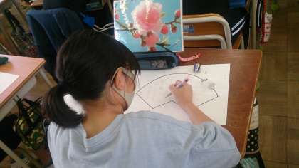 6年生は、俳画の創作に取り組んでいます。俳画は、俳句の内容を絵に表し、題材の句を賛する日本画のひとつです。子どもたちは、いろいろな種類の写真の花をヒントに下絵を描いています。
