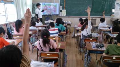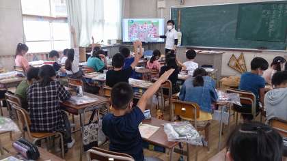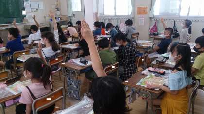 4年生の外国語活動で保健室や体育館等、学校の施設名についての学習に取り組んでいます。子どもたちは積極的に発表しています。