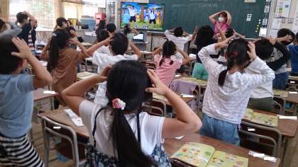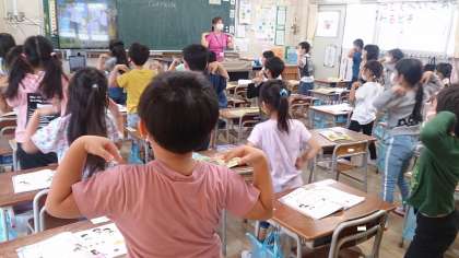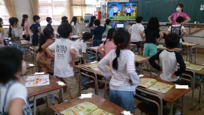 1年生の音楽で、「チェッチェッコリ」の曲に合わせてダンスをしています。リズムに乗って、子どもたちは、とても楽しそうです。