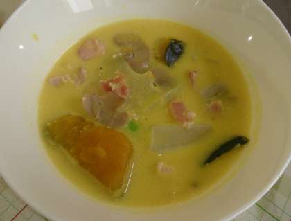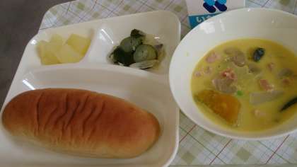 今日の給食は、かぼちゃのクリームシチュー、ミックス海そうのサラダ、りんご(カット缶)、パン、牛乳です。