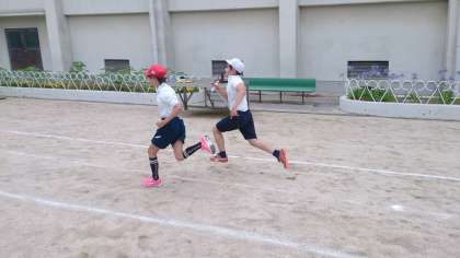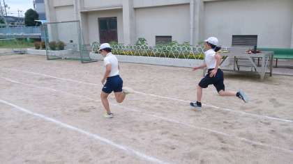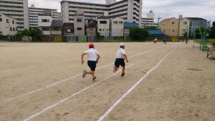 6年生の体育で、50m走のタイムの測定しています。「前よりタイムがよくなりました。」とにこやかに伝えてくれる児童もいました。子どもたちは集中して真剣に走っています。
