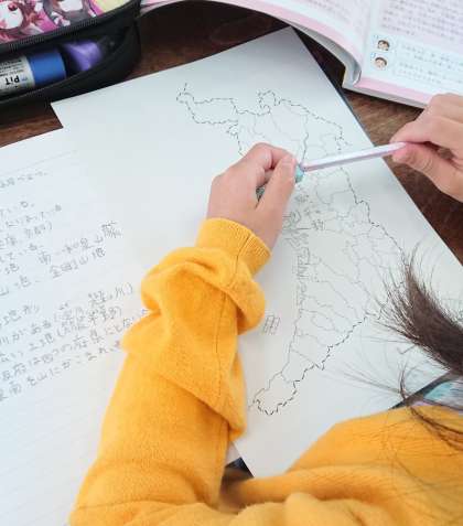 大阪府の地形について学習しています。白地図に「大阪平野」や「淀川」などを書き込んでいきました。
