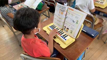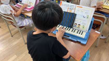 鍵盤ハーモニカの練習をしています。運指を確認中です。