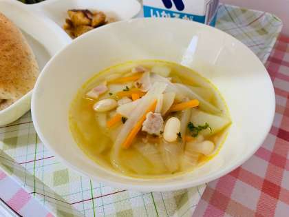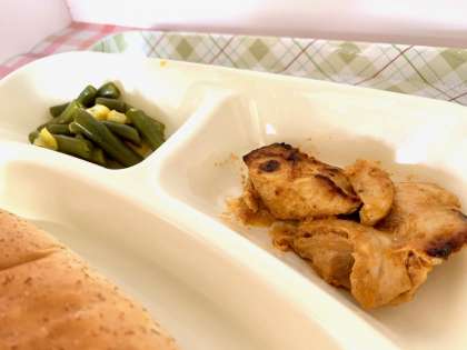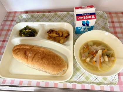 今日の給食は、(ライ麦)パン、牛乳、鶏肉のカレーマヨネーズ焼き、てぼ豆のスープ、さんどまめとコーンのサラダです。